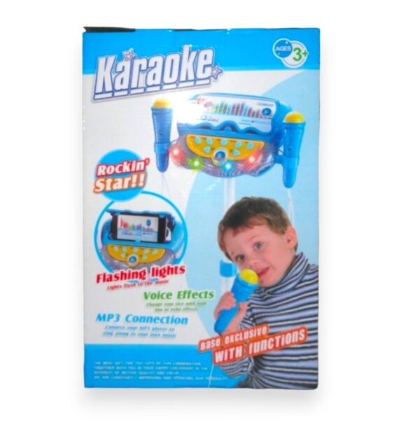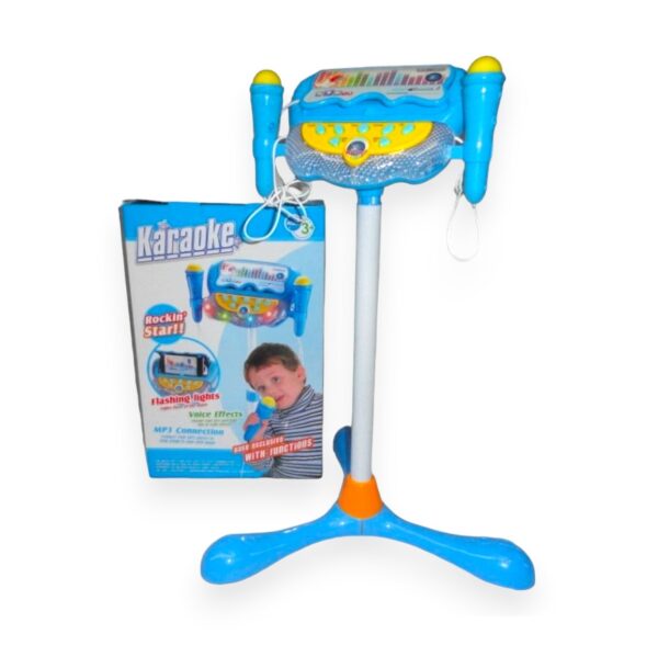 Increíble karaoke con atril ajustable y doble micrófono a pilas, puedes conectar tu celular o mp3 para reproducir y cantar tus canciones favoritas, tiene efectos de voz, luz y sonido. Recomendado a partir de 3 años.