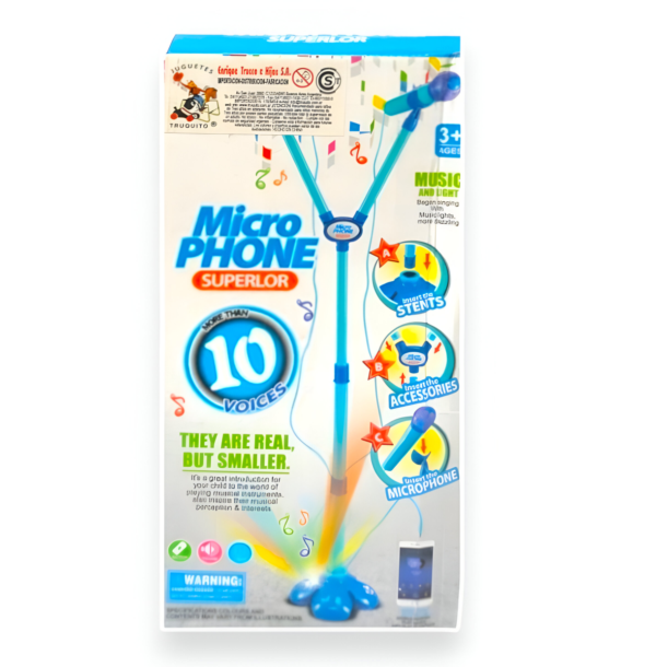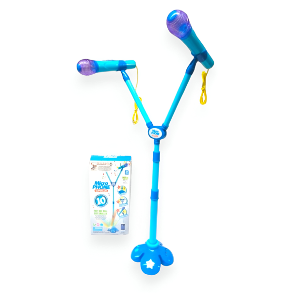 Increíble micrófono doble ajustable a pilas, pie con efectos de luz y más de 10 sonidos, puedes conectar tu celular o mp3 para reproducir y cantar tus canciones favoritas. Recomendado a partir de 3 años.