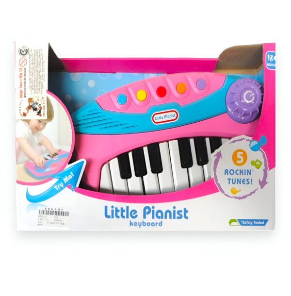Teclado a pilas. Mejora la capacidad cognitiva, logra un aprendizaje temprano a través de sonidos que desarrollan la capacidad auditiva, 5 canciones que cultivan su aptitud musical y reconocimiento de colores. Recomendado a partir de 3 años.