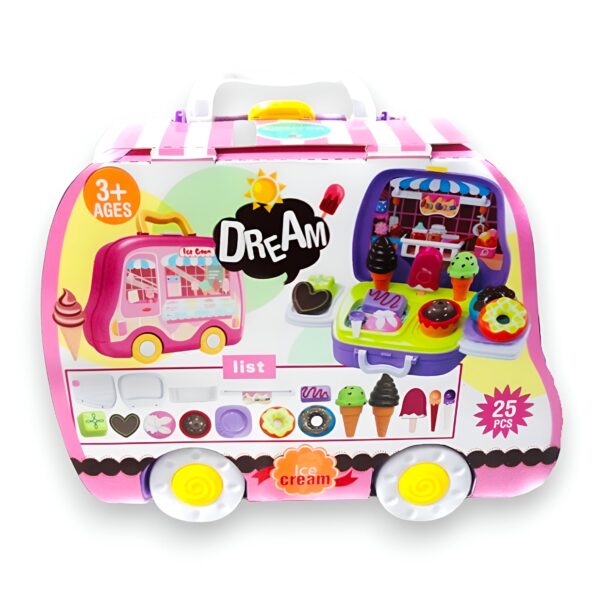Set de Heladería en valija rodante. Contiene 25 piezas: conos, paletas, donas, accesorios y stickers decorativos. Recomendado de 3 años en adelante.