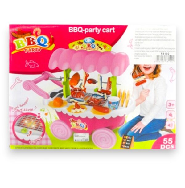 Set de BBQ en carrito rodante con luz y sonido a pilas. Contiene 55 piezas: platos, comidas, accesorios, pizarra con menú, dinero y stickers decorativos. Recomendado de 3 años en adelante.