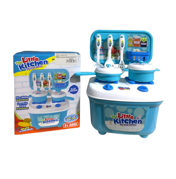 Cocinita que contiene 12 piezas: ollas, vegetales y accesorios. Disponible en 2 colores: rosa  y azul. Recomendado de 3 años en adelante.