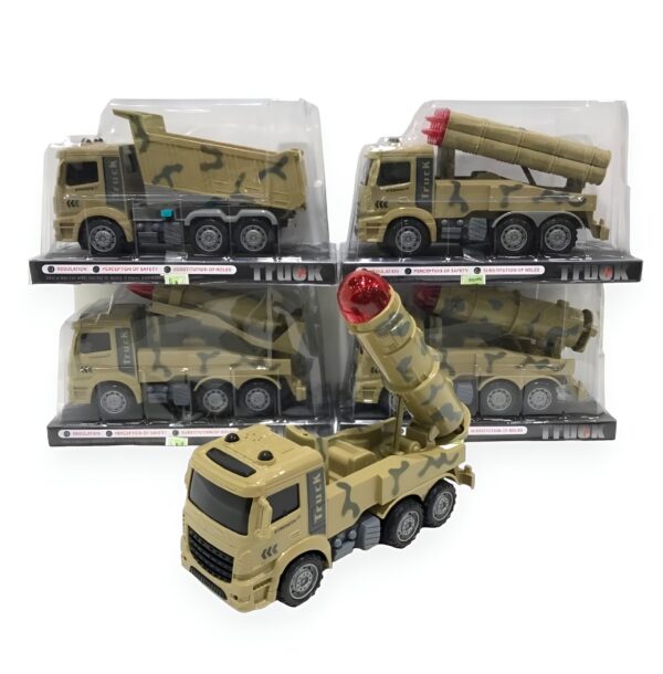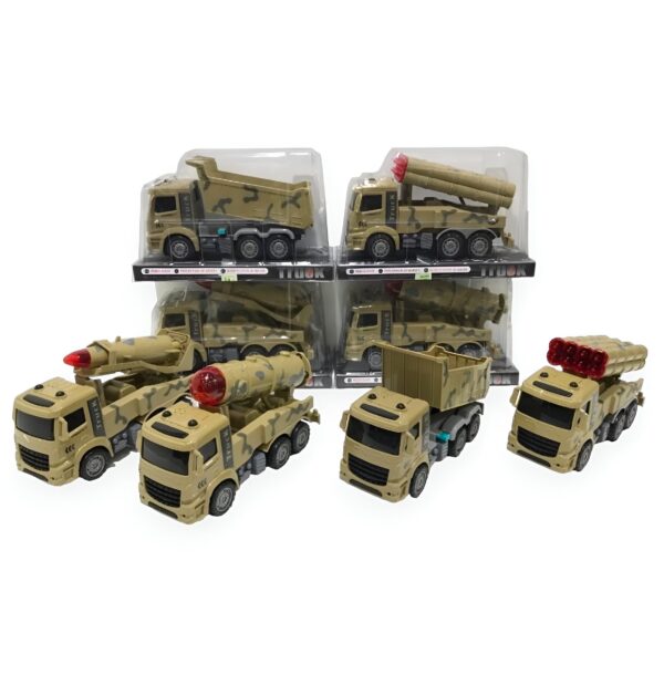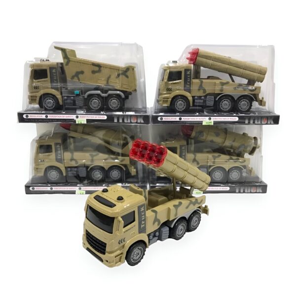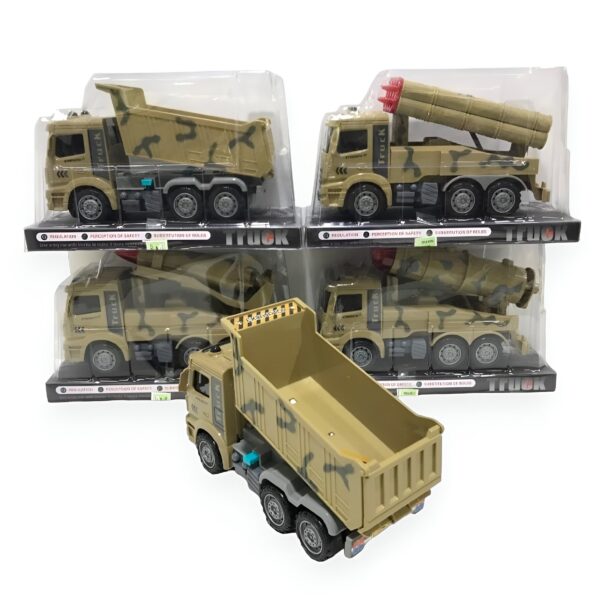 Camión Militar en cuatro modelos diferentes con sistema de fricción, lo que les permite experimentar la acción y la emoción de la conducción militar. Con sus colores camuflados y diseño detallado, estos camiones estimulan la imaginación y el juego creativo de los niños, invitándolos a crear emocionantes escenarios de combate y aventuras militares. Recomendado de 3 años en adelante