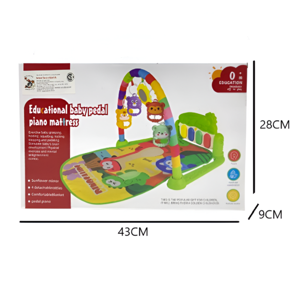 Alfombra interactiva para bebés y niños pequeños, combina la diversión de tocar un piano con la estimulación sensorial de los sonajeros colgantes. Es suave y acolchada cuenta con un teclado de piano que los niños pueden tocar con los pies o las manos para producir música, los sonajeros colgantes añaden una dimensión adicional de diversión y exploración. Promueve el desarrollo sensorial, la coordinación manual-visual y la creatividad en los más pequeños.