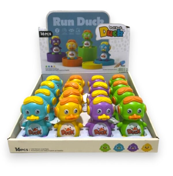 El Patito Pullback se ofrece en cuatro colores encantadores y se presenta en una caja exhibidora con 12 unidades. Con su ingenioso mecanismo de Pullback, los pequeños se deleitarán viendo cómo se deslizan hacia adelante, proporcionando entretenimiento mientras mejoran sus habilidades motoras y coordinación. Recomendado para niños a partir de 3 años en adelante