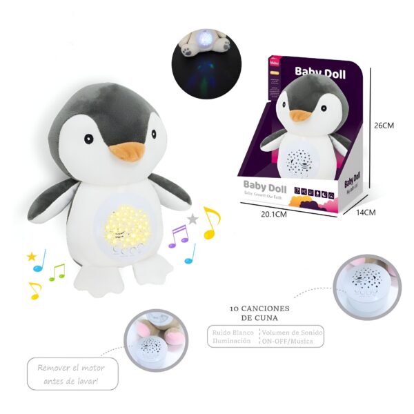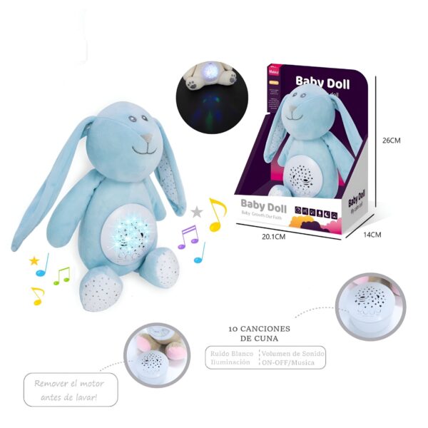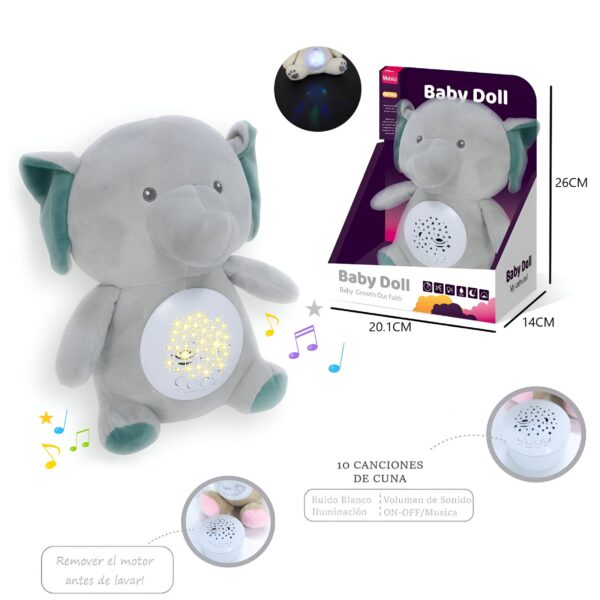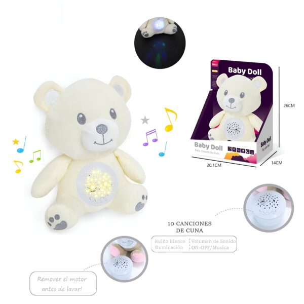 Este tierno osito de peluche acompaña a los más pequeños a la hora de dormir. Reproduce 10 melodías suaves (ruido blanco), incluye control de volumen y proyecta luces. Su diseño permite retirar el módulo musical para facilitar el lavado. Disponible en 6 modelos. Recomendado a partir de 3 años