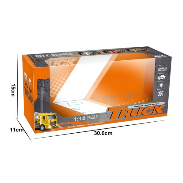 Camión de bomberos funciona con tecnología de radio control de 27MHz que permite avanzar, retroceder y girar. Su diseño incluye una manguera en la parte superior para lanzar agua de forma manual. Recomendado a partir de 6 años
