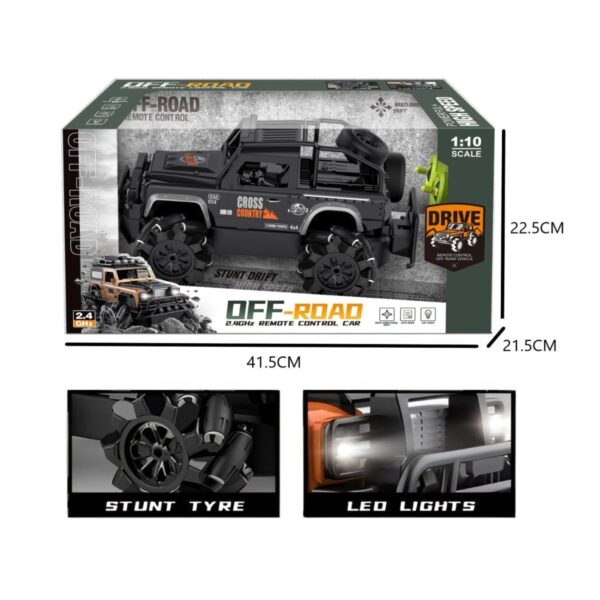 Camioneta Off-Road a control remoto, ideal para terrenos difíciles y aventuras extremas. Con ruedas multidireccionales que permite realizar giros de 360°, derrapes y acrobacias. Incorpora luces LED delanteras. Incluye Control remoto 2.4GHz para mejor estabilidad y control a larga distancia. Viene con batería recargable y cargador USB. Recomendado para niños a partir de 6 años