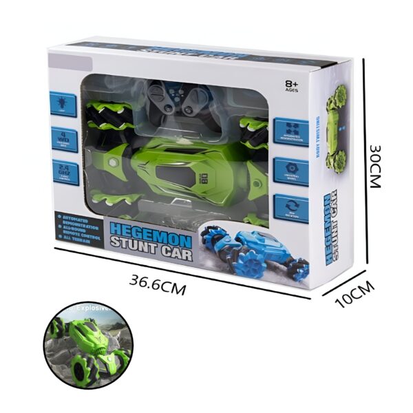 Auto a radio control, disponible en dos colores: Azul y Verde. Realiza giros de 360° y acrobacias. Cuenta con luces y sonido. Incluye batería recargable y cable USB. Su control remoto de 2.4G ofrece gran alcance y precisión. Recomendado para niños a partir de 6 años