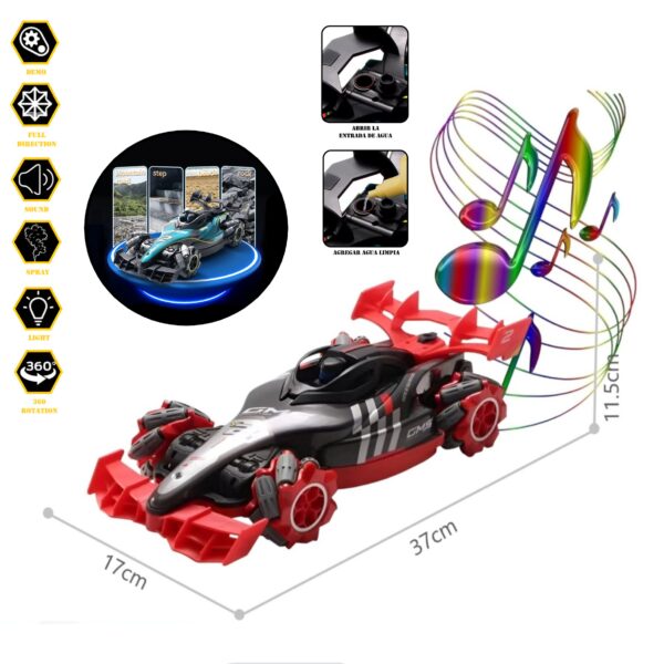 Auto F1 a radio control, cuenta con ruedas multidireccionales que permiten giros de 360°, desplazamientos en todas las direcciones y maniobras. Incluye luces LED delanteras y traseras, efecto de vapor trasero que simula un turbo (funciona con agua) y sonido. Viene con batería recargable y cable USB. Recomendado para niños a partir de 6 años