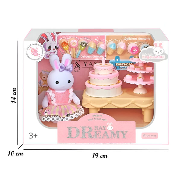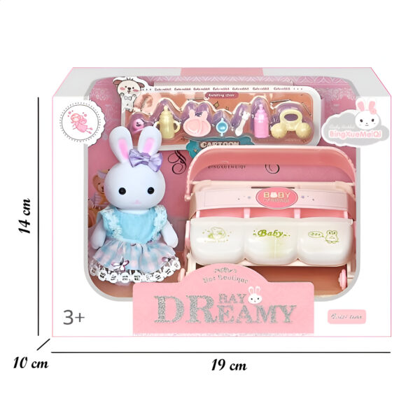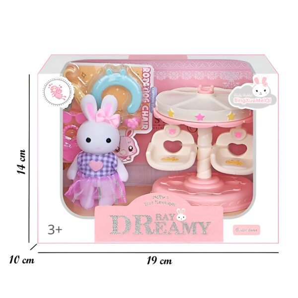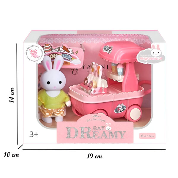 Set de conejito, disponible en 4 modelos diferentes que incluyen: un tierno conejito y distintos accesorios temáticos como carrito de helados, cochecito, columpio y pastelería. Cada set cuenta con un escenario adorable. Fomenta el juego creativo y la imaginación. Recomendado a partir de 3 años