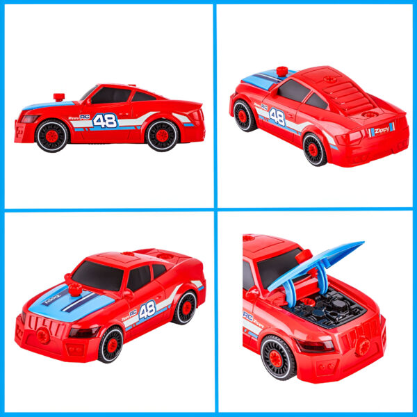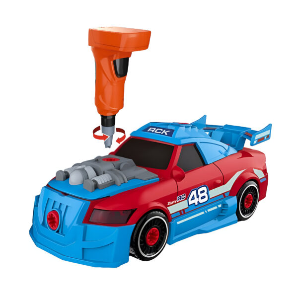 Auto Desarmable BM Rojo, incluye 25 piezas: un destornillador eléctrico a pilas, ruedas intercambiables, tornillos, y partes desmontables para armar, desarmar y modificar el auto deportivo. Cuenta con detalles como el capó que se abre y herramientas adaptadas. Fomenta la creatividad, la motricidad fina y el juego imaginativo. Recomendado a partir de 3 años