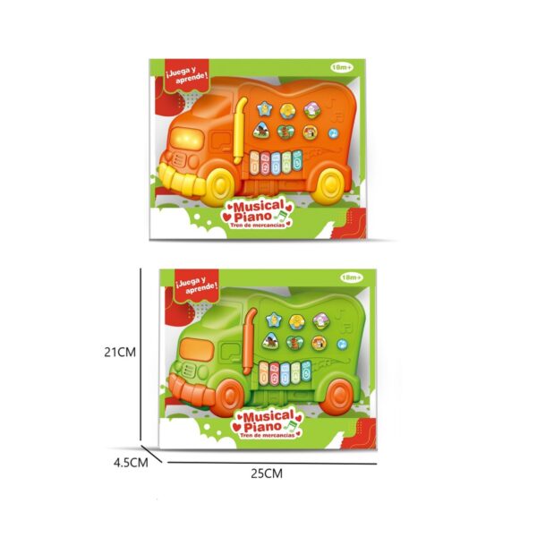 Divertido piano musical con diseño de auto y camión, incluye teclas de colores y botones con sonidos variados para estimular la creatividad y el desarrollo auditivo. Está disponible en 4 colores, funciona a pilas y es ideal para pequeños a partir de 3 años
