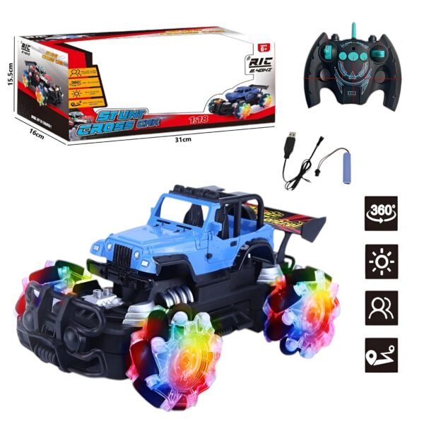 Jeep radio control en escala 1:18, disponible en 3 modelos. Realiza acrobacias gracias a su capacidad de giro 360° y sus llamativas ruedas. Su tecnología 2.4 GHz permite un control preciso y sin interferencias. Funciona con batería recargable e incluye cable USB. Recomendado para niños a partir de 6 años