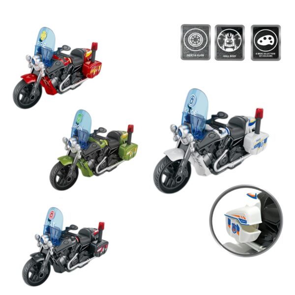 Motos policiales. Cuenta con sistema de fricción, cuerpo metálico y accesorios móviles. Disponible en 4 modelos: POLICIA, FUERZAS ESPECIALES, BOMBEROS y EJERCITO, cada uno con su respectiva identificación y colores distintivos. Incluye luces simuladas, sirena decorativa y compartimientos que se abren. Viene en caja exhibidora x12 unidades. Recomendado para niños a partir de 3 años