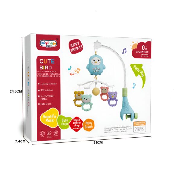 Cunero musical a pilas, disponible en dos colores: celeste y rosado, incluye un soporte que se adapta fácilmente a la cuna y un ave musical con colgantes de animalitos que emite suaves melodías para ayudar a calmar y adormecer al bebé