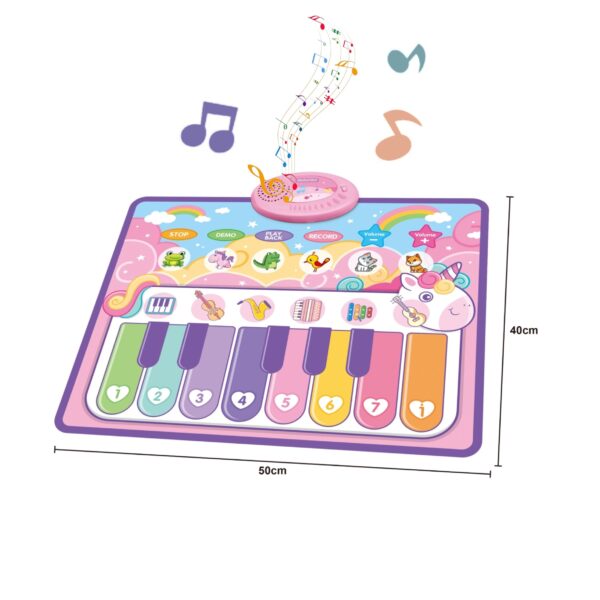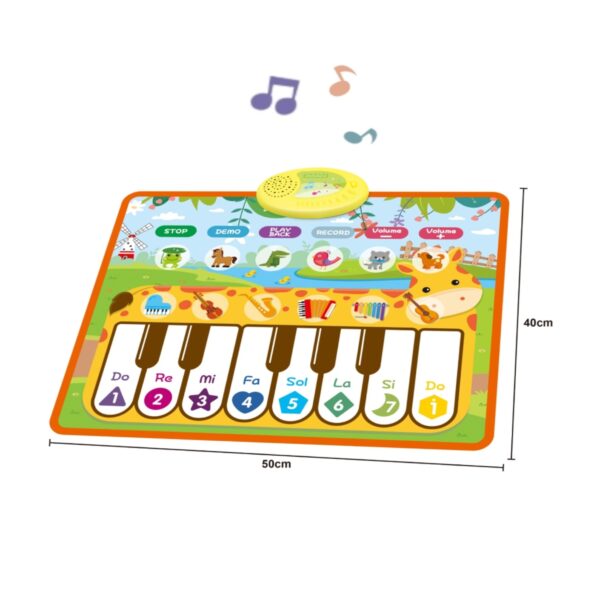 Alfombra con piano a pilas en 5 modelos diferentes, cada uno presenta diseños y colores únicos. Ayuda a desarrollar habilidades motrices, coordinación y sentido del ritmo. Recomendado para niños de 3 años en adelante